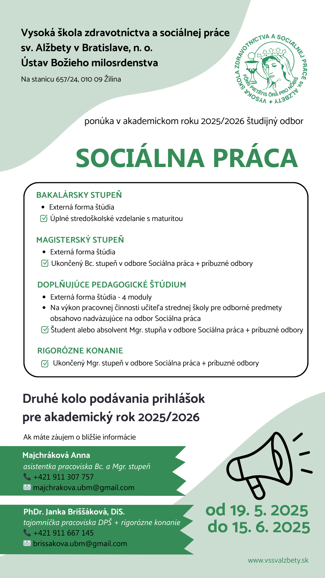 2.kolo podávania prihlášok pre AR 2025/2026 v odbore Sociálna práca na pracoviska UBM Žilina viac informácií TU