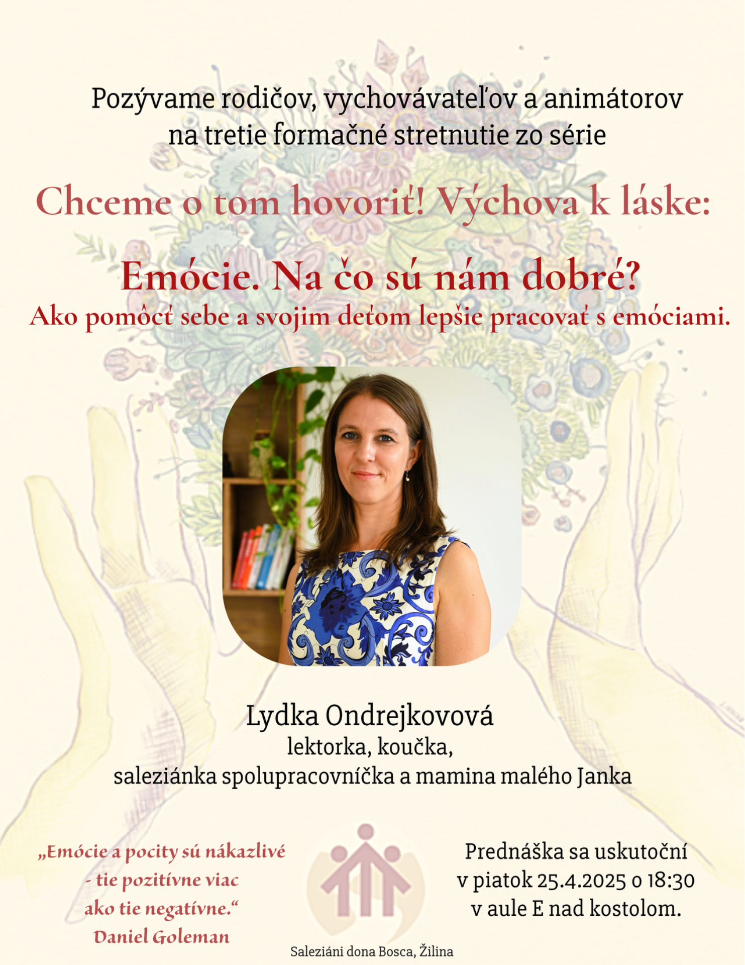 Pozývame vás na tretie formačné stretnutie zo série Chceme o tom hovoriť! - Výchova k láske. Na tému: "Emócie. Na čo sú nám dobré?" sa nám prihovorí lektorka, kaučka a saleziánska spolupracovníčka Lydka Ondrejkovová. Prednáška sa uskutoční v piatok 25.4.2025 o 18:30 v aule E nad kostolom.
