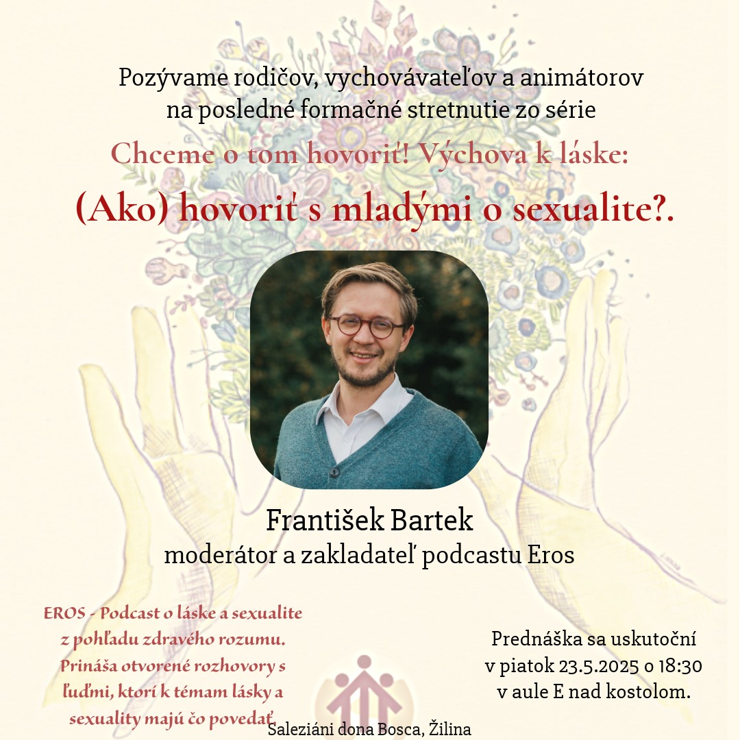 Pozývame vás na tretie formačné stretnutie zo série Chceme o tom hovoriť! - Výchova k láske. Na tému: "(Ako) hovoriť s mladými o sexualite?" s moderátorom a zakladateľom podcastu Eros - Františkom Bartekom. Prednáška sa uskutoční v piatok 23.5.2025 o 18:30 v aule E nad kostolom.